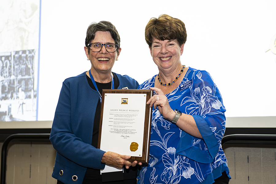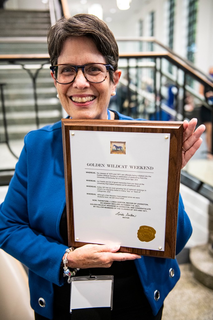 At the Golden Wildcat Society 50th Reunion Dinner, Lexington Mayor Linda Gorton, who also happens to be a member of the class of 1971 in the College of Nursing, read a proclamation declaring Oct. 7-10, 2021, as Golden Wildcat Weekend in Lexington.