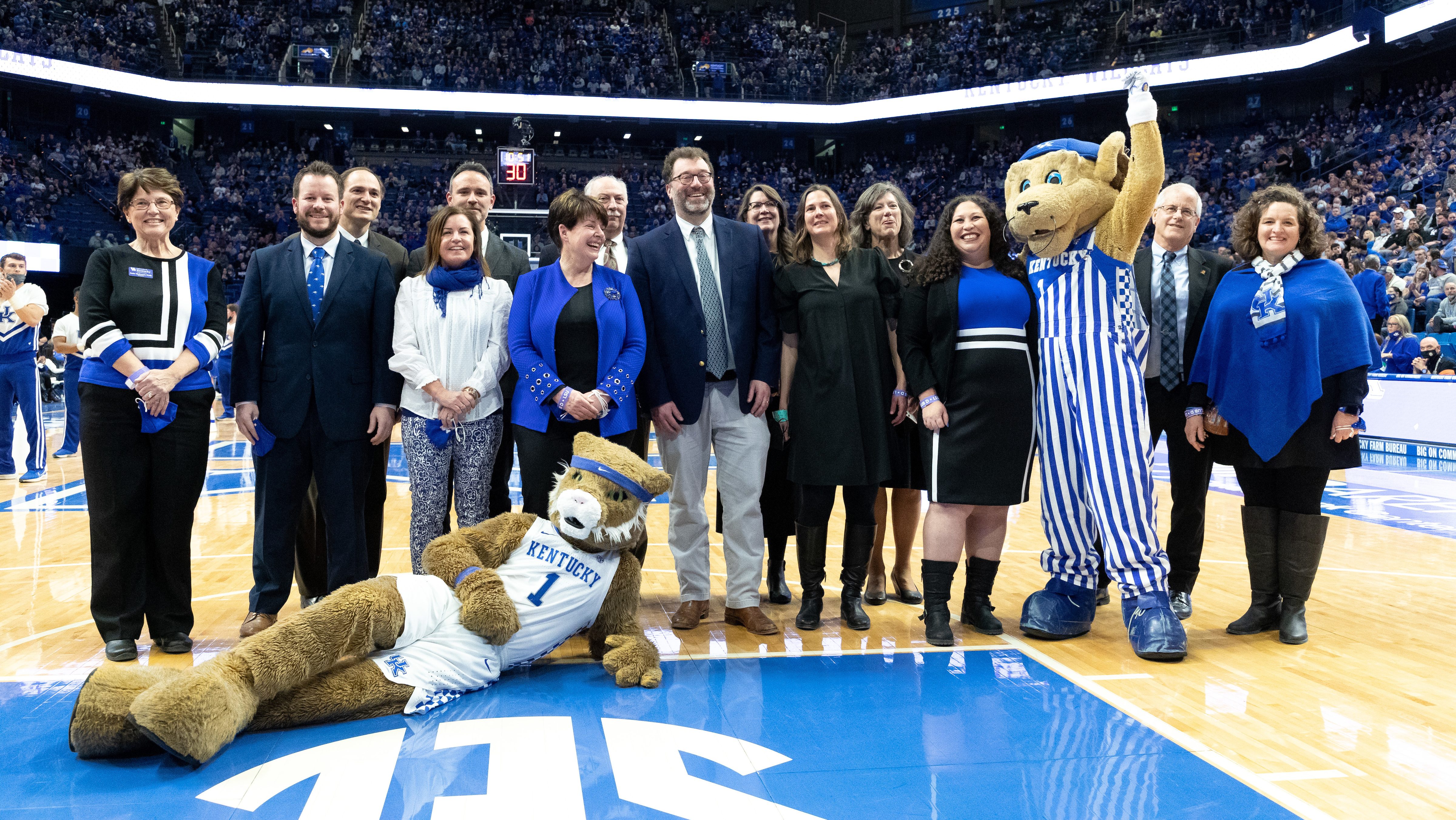 Due to COVID-19 restrictions, the 2021 Great Teacher Award recipients were unable to be recognized on the floor of Rupp Arena at a Kentucky men’s basketball game. On Wednesday, Feb. 23, 2022, the 2021 and 2022 Great Teacher Award recipients were recognized together before the LSU vs. Kentucky men’s basketball game. Pictured above from L-R are: Janie McKenzie-Wells (2020-2021 UK Alumni Association Awards Committee Chair), Clark Kebodeaux, Christopher Crawford, Hannah Myers (2020-2021 UK Alumni Association President), Chad Risko, Mary Shelman (2021-2022 UK Alumni Association President), Wayne Sanderson, Zachary Bray, Beth Rous, Cortney Lollar, Beth Barnes, Olivia Davis, Jack Groppo and Tonya Parsons (2020-2021 UK Alumni Association Awards Committee Chair).